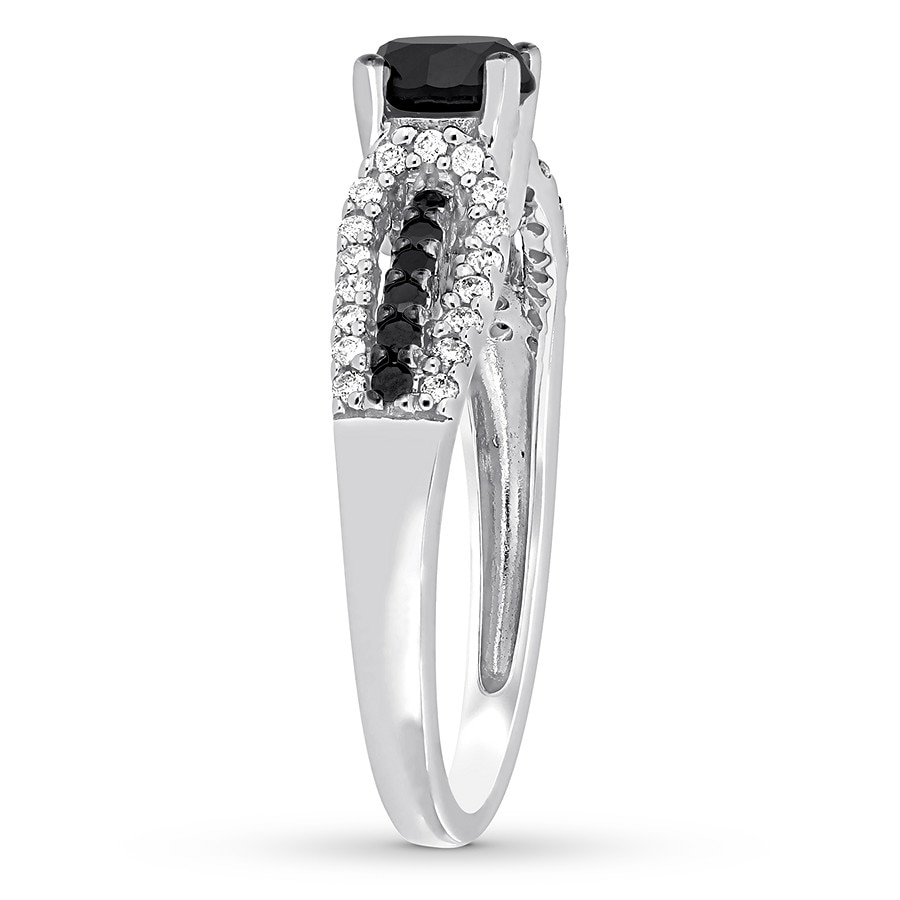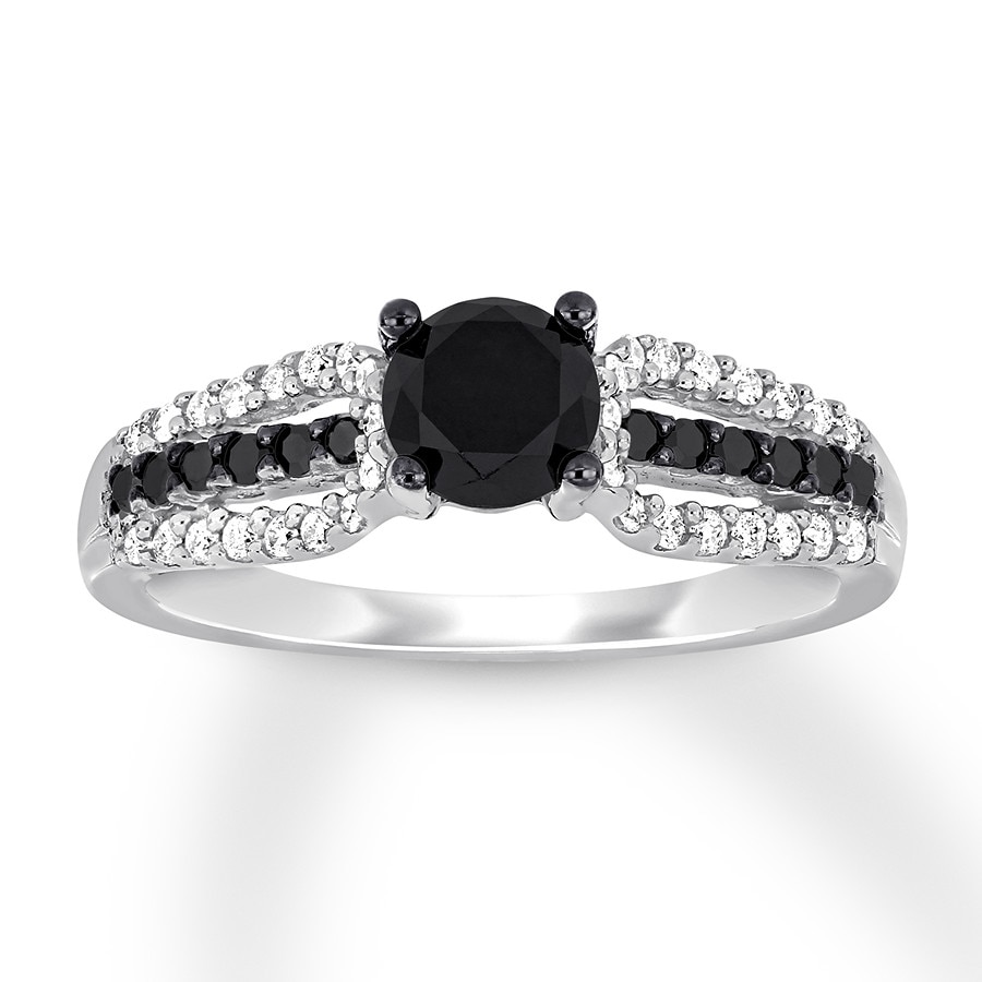 A round black diamond is the striking focal point of this elegant engagement ring. More black diamonds complement dazzling white diamonds along the band, crafted of 14K white gold. The ring has a total diamond weight of 7/8 carat. Black diamonds are treated to permanently create the intense black color.