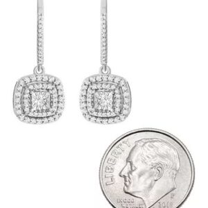Tremendous sparkle radiates from these stunning round-shape diamond halo drop earrings exquisitely fashioned in luxurious sterling silver.