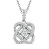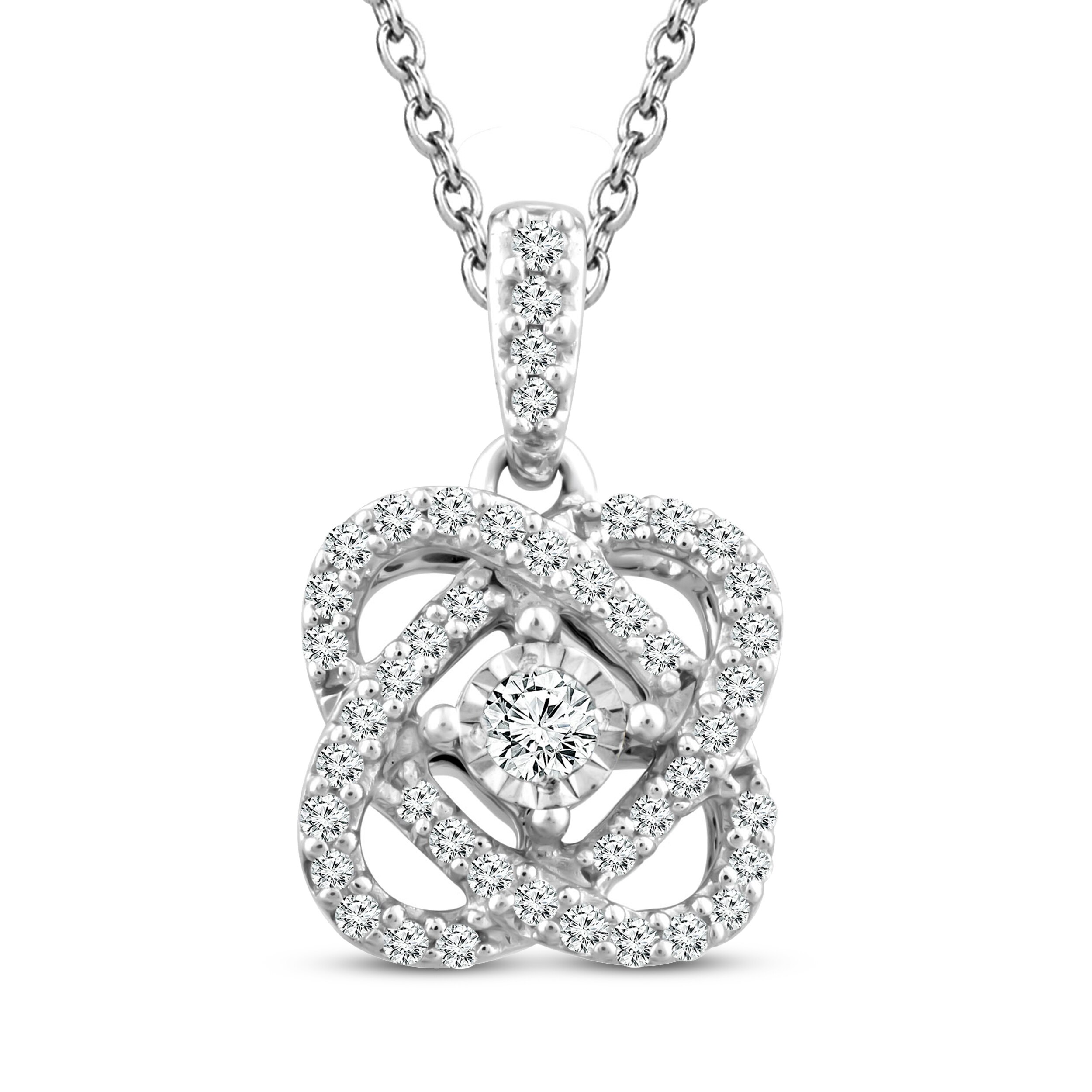 This enchanting diamond necklace serves as a beautiful reminder that through life’s twists and turns, love keeps you centered. Featuring a stunning round center diamond and surrounded by an interwoven swirling design of diamonds, the pendant has a total diamond weight of 1/10 carat. The pendant is crafted of sterling silver and hangs on an 18-inch cable chain that secures with a spring ring clasp.