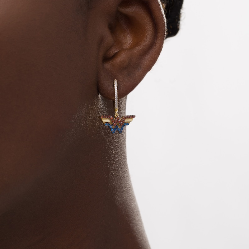 Express your epic style with these vibrant gemstone and diamond drop earrings. Crafted in warm 10K gold, each eye-catching drop features bright blue sapphires and regal garnets bringing color to the classic logo. Diamonds sparkle along the hoop above the dangle. Captivating with 1/15 ct. t.w. of diamonds and a brilliant buffed luster, these earrings secure with hinged backs. This exclusive fine jewelry collection inspires you to wear your strength, confidence and power.