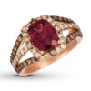 A vivid Raspberry Rhodolite Garnet framed in Nude Diamonds graces the center of this luscious ring for her. Rich Chocolate Diamonds sweep across the top and bottom of the band. Fashioned in 14K Strawberry Gold, the ring has a total diamond weight of 7/8 carat.